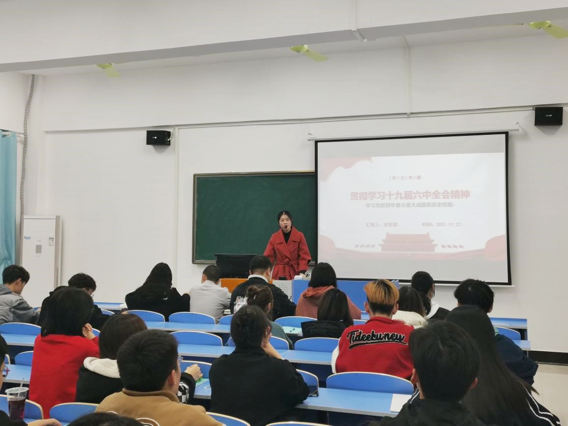 此次党的十九届六中全会精神专题学习会由马克思主义学院副教授史苗苗主讲,史老师以党的百年历史为切入点,为学员们深入解读了解读十九届六中全会的“三个需要”“两个确立”“五大历史意义” “十个坚持”“牢记一个根本问题”“四个必须”“一个号召”等核心要点,勉励青年学子们要深刻理解全会精神,提高自身的政治责任感与使命感,通过自身的不懈奋斗为国家发展助力、为自我人生添彩。