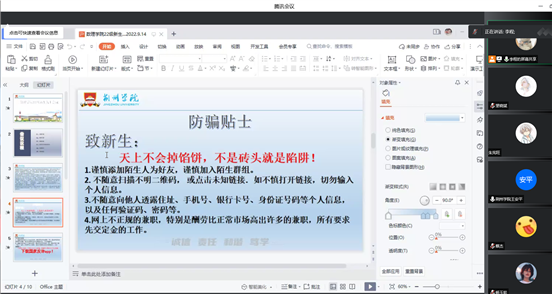 本次会议内容共六项,主要针对新生进行一些学校及学院知识的普及以及对新生进行反诈骗方面的知识宣传。